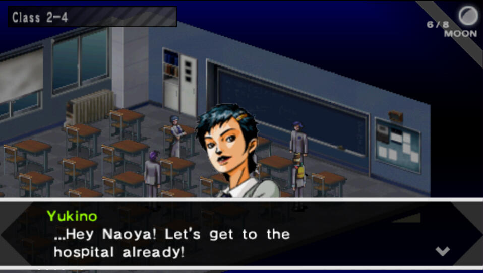 Enter the Teacher's Lounge immediately beside it on the left and talk to the male teacher in a brown suit. After this, talk to Mark. Exit the lounge and take a left (north) and take the stairs to 2F. Turn right (south) then continue walking along the hall until you reach the last door on the right, just before the next set of stairs. Enter to overhear a short conversation. Exit the room then go straight (east) and enter one of the last two doors on the right. You'll watch a short scene with Reiji. Exit the room, then backtrack to the stairs you used to come up to 2F and right across from them is Class 2-1. Talk to the generic NPC there and he'll talk about dismantling derelict buildings.Head to Class 2-4 and have a short conversation with Yuko. When she asks you to deliver a message to Maki, accept her request. At this point you can leave the school if you like, so explore 'til your heart's content, and then head down to the exit on 1F when you're ready. After a few scenes you'll find yourself on the City Map.