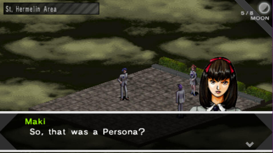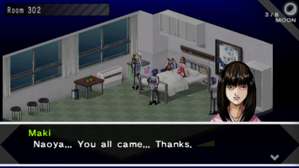 From the area of the map with Joy Street, just head north one screen to find Mikage Hospital. After entering, there is a short cutscene. Once it's over, go ahead and enter the door. Maki is in Room 302 so just head straight to 3F and enter the second door on the right.After some scenes, you will find yourself looking at the battle screen for the first time. This first battle happens automatically like a cutscene. After the battle you will all level up, go ahead and allocate your MC's points however you like. The other party members will auto-allocate their points. Once the scenes are all over and you're in control again, speak to everyone if you like, and then exit the room.There will now be random encounters. Please note that the Analyze feature does not take up a turn, and all you have to do to unlock the details for each creature is defeat them in battle once. From then on, you'll have all their weaknesses and info when you encounter them again. This is a crucial and very useful feature.The Contact feature allows you to enter a negotiation with the demons to gain various things such as items, or healing. But the most important thing here is Spell Cards. To get their Spell Cards, you must raise their eagerness (yellow) to max. This is honestly kind of hard to figure out on your own, so I have included a complete guide on what to say to each specific persona hereTurn south and enter the first room around the corner to find the 2F Nurse's Center. Open the chests to find Medicine x6 and QQ Helmet x2. Equip the helmets, exit the room, and head west. Enter the room around the corner to find an Agastya Tree. When finished, head up the stairs to 3F.Follow the path until you reach the second fork. Enter the Nurse's Station to the right and open the chests to find DisPoison and QQ Helmet x2. Equip the helmets on your other two team members, then exit the room. Head down the halls northwest until you find the stairs. Go downstairs to 2F.Follow the left hallway around to the first room you see to find another Agastya Tree. Then, head straight east to find another set of stairs. Go down the stairs to 1F.Hug the corner around to the right and follow the hallway until you reach a fork. Take a right at the fork and you'll find a room with a doctor in it. He will heal you, so this hallway is a great spot to grind a bit before moving on. I recommend doing so. Your personas will rank up faster if you use their skills in battle. Make sure to open the chest to find Medicine x2.Once you are ready to move on, take the other path from that fork until you reach a room straight ahead at another fork. Enter to find an Agastya Tree. Go around to the room behind this to find the Reception Desk.After the cutscene you'll have the option to save the nurse or not. If you decide to save the nurse,