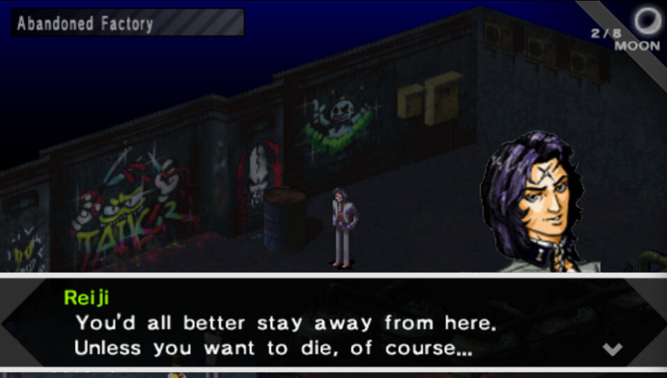 Once you're in control, speak to the girl here and then exit left after Maki. You'll notice that the hole in the wall is mysteriously gone. Enter the door to the school and head west to find the infirmary straight ahead at the end of the hall. After a quick scene, heal up and save your game.Next, head to 2F and find Class 2-5 right at the top of the stairs, and enter. The cutscene will explain a lot more of what's happening. Once you're in control, leave the classroom to see that the school map has now rearranged itself again. Head down the hall to the first room you see, it's a Velvet Room, and next to this room is the Infirmary. Two rooms north of the Infirmary is a General Store. This is a great place to grind and try to get spell cards if you like, but the Lilim enemies here cast Charm on your party and Mudo which makes you die in 2 turns, and it can get really frustrating.In this dungeon, there are doors that will teleport you to other places. You need to enter the correct doors in the right order to find the boss. If you turn to the right along the hallway next to the General Store, you'll find two of those doors. Enter either one.Now head north, and you'll pass Class 2-1, and the hall turns east. Head east to those two doors on your left(east). Enter either one.Now, just northeast is a fork. Take the south path to find an Agastya Tree with a locked room beside it. Save your game, and head to the nearby hall that heads east right to a staircase, and take the stairs up to 2F.Now just head south west until you hit the big fork and take the west path, and follow it around north, west, and south again to reach a classroom and enter. Do NOT pass the first classroom door, or you will fall down to the next floor through a hole.Reiji Recruitment: If you did all the previous Reiji steps and you also did not invite any other members as your 5th person, Reiji will automatically join you after this cutscene.After the cutscene, you can open the left and right chest for a Metal Card and Turquoise. Do not open the middle chest, all it does is poison you. Exit the classroom through the top door to to go around the pitfall in the hallway. Head around the corner and enter one of the two doors to teleport to the next area.Now head west, and then as far south as the map will let you, then turn east until you hit a corner, head north and you should see stairs around the corner from the middle path. Head down to 1F.Right around the corner to the west is an Agastya Tree and a Velvet Room. When you are read, head into the big room to the south for a boss fight.Boss: Tesso: This is just an endurance battle. Tesso has a gatling gun attack that deals high damage to a single target,