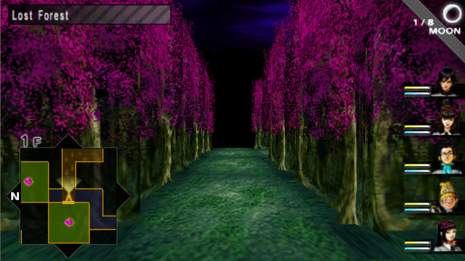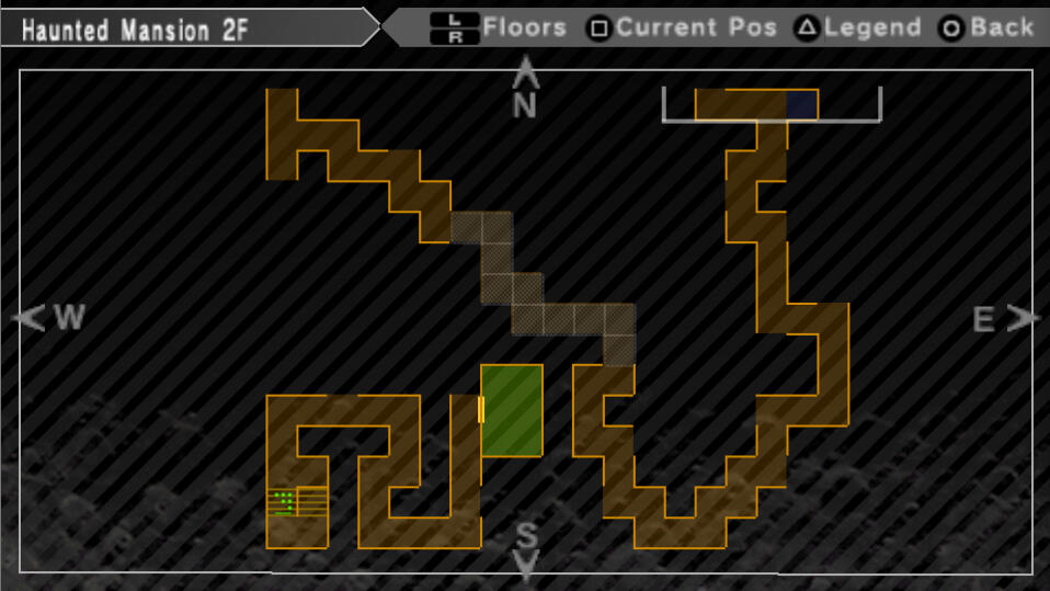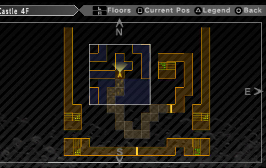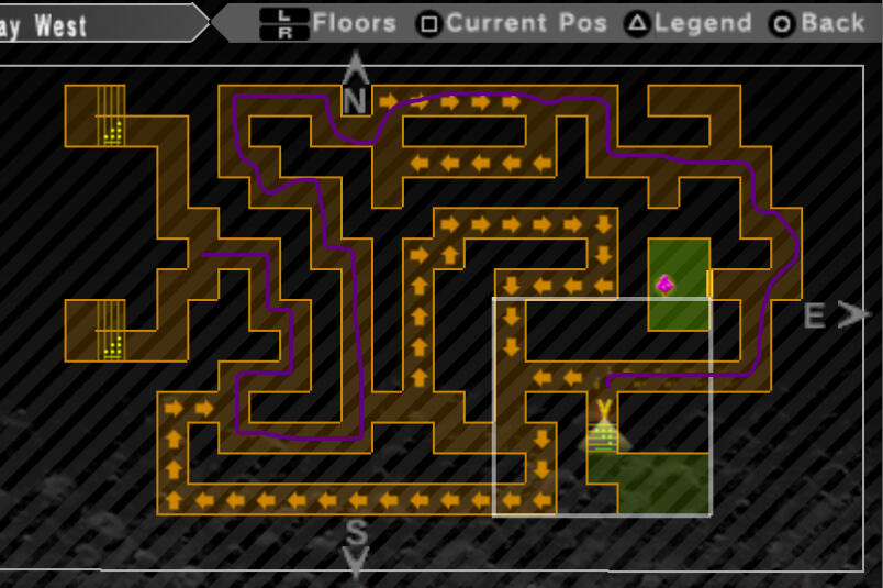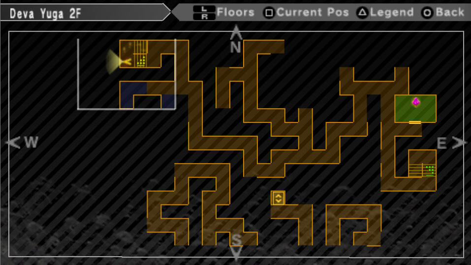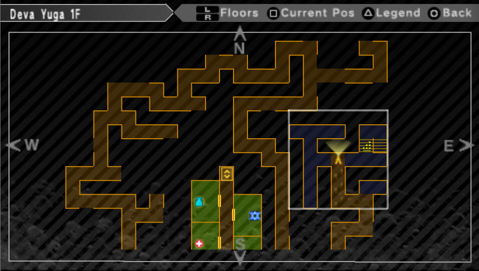 Straight ahead as you enter, there are a bunch of rooms for you to prepare yourself for going directly into another dungeon. The first room on the right is an Agastya Tree, behind it is a Velvet Room. On the left side of the hall is a Fairy Spring and a General Store. When you're ready, take the elevator to 2F.On 2F, head east, south, east, north, and south at the fork and keep heading south until you see a room to the west. Enter. Open the three chests to obtain Muscle Drink x4, Chewing Soul x2, Repulse Bell. Go ahead and retrace your steps back to the elevator and take it up to 3F now.On 3F , head south until you reach the fork. We are heading east here, but just FYI, if you were to go west, and through the gate north, there is a hole that makes you fall down to 1F if you need to go back to save, heal, etc. Anyway, head east at the fork, through the open area, and take the first hallway that leads south. keep following this path until you see a staircase to the west and go down these stairs to 2F.On 2F, it's a pretty easy path so just follow it north and back south until you reach another staircase. Take them down to 1F.On 1F, head west and a bit south to find an Agastya Tree room. When you're ready, go ahead and go back east from the room and head north. When you hit the fork, head west and then north and try to work your way to the east side of the map to find another set of stairs. There is a screenshot below to help since this floor is a bit complex. Take the stairs up to 2F.